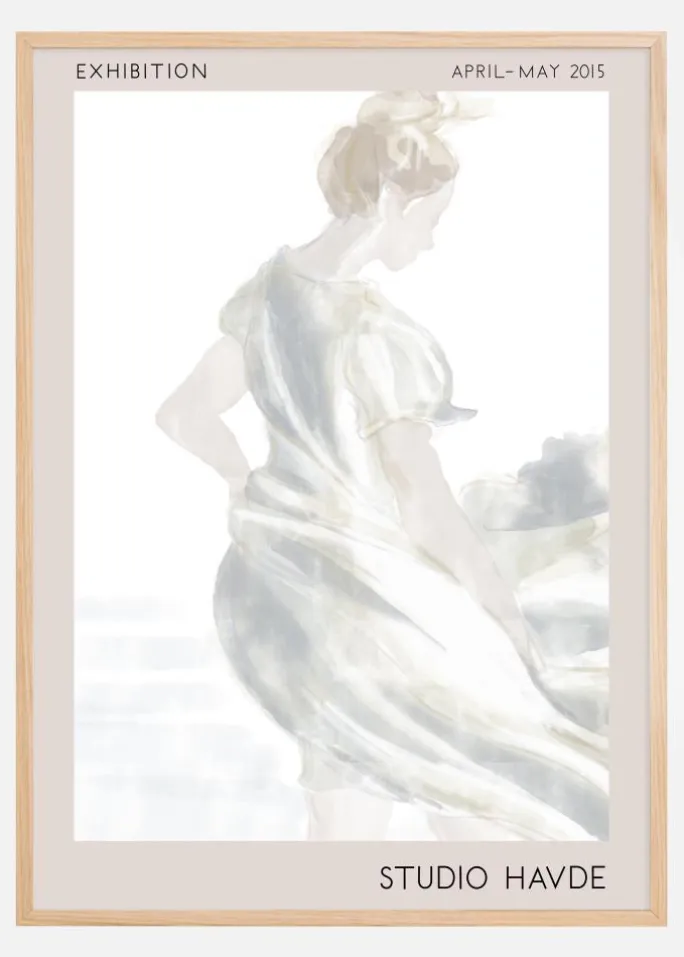 Dette kunstværk er en ode til feminin ynde og kunstnerisk finesse, og tilføjer et sofistikeret touch til hvilket som helst rum. Den enkle og rene typografi i over- og underkant giver en moderne følelse, samtidig med at den respekterer billedets klassiske skønhed. Indrammet i en subtil egetræsramme, er denne plakat ikke kun en hyldest til Studio Havdes kunstneriske arbejde, men også en invitation til betragteren om at fortabe sig i billedets dybde og subtilitet.