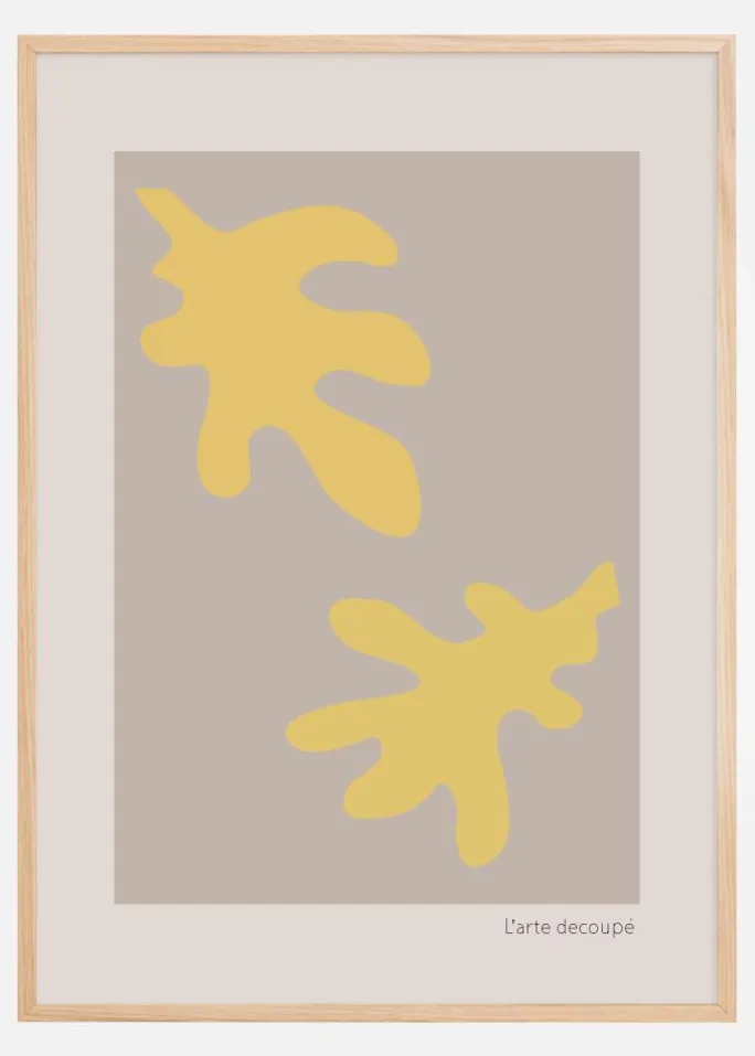 Denne dristige og livlige plakat, ‘L’arte découpé’, er en del af en serie, der fanger essensen af moderne kunst med et legende twist. Dette unikke print har to abstrakte figurer i en kraftfuld gul farve, der skiller sig ud mod en sofistikeret mørkegrå baggrund. De flydende former er både dynamiske og tiltalende og giver indtryk af at svæve frit på overfladen. Med dets varme og energiske farvesætning er dette en plakat, der giver liv og karakter til ethvert rum, den placeres i, fra stuer til kreative arbejdsområder.