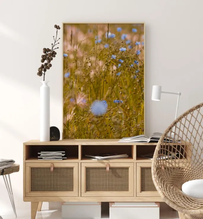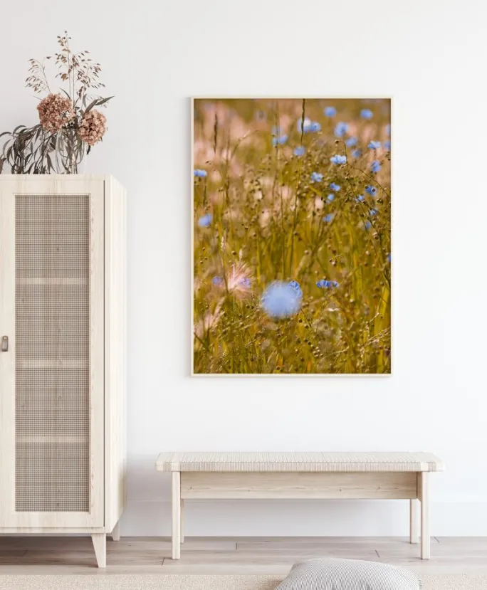 En levende plakat med et væld af blå blomster på en lysegrøn mark. Sommeren er her i dette billede, hvor farverne springer ud i hele billedet. Blå og lyserøde hvide blomster blander sig i dette sommerlige felt og hjælper dig med at bringe den varmeste årstid direkte ind i dit hjem.