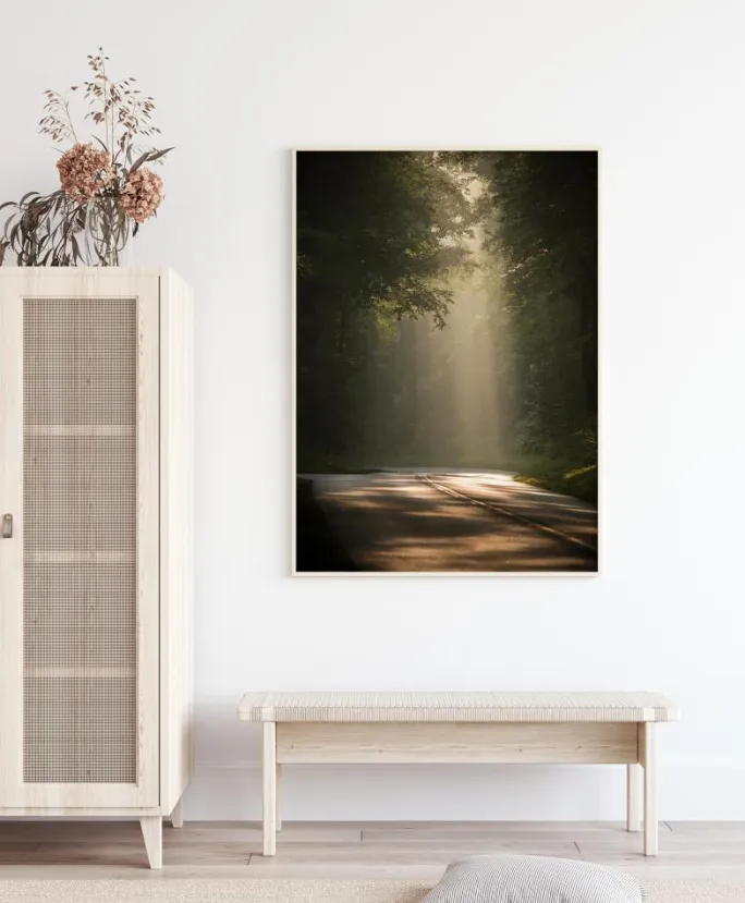 En fredfyldt plakat af en vej, der snor sig mellem høje grønne træer i et skovområde. En gylden lysstråle strømmer ned fra oven og skaber et plettet mønster på vejen. Følg vejen gennem denne skov for at få en virkelig fredfyldt rejse.