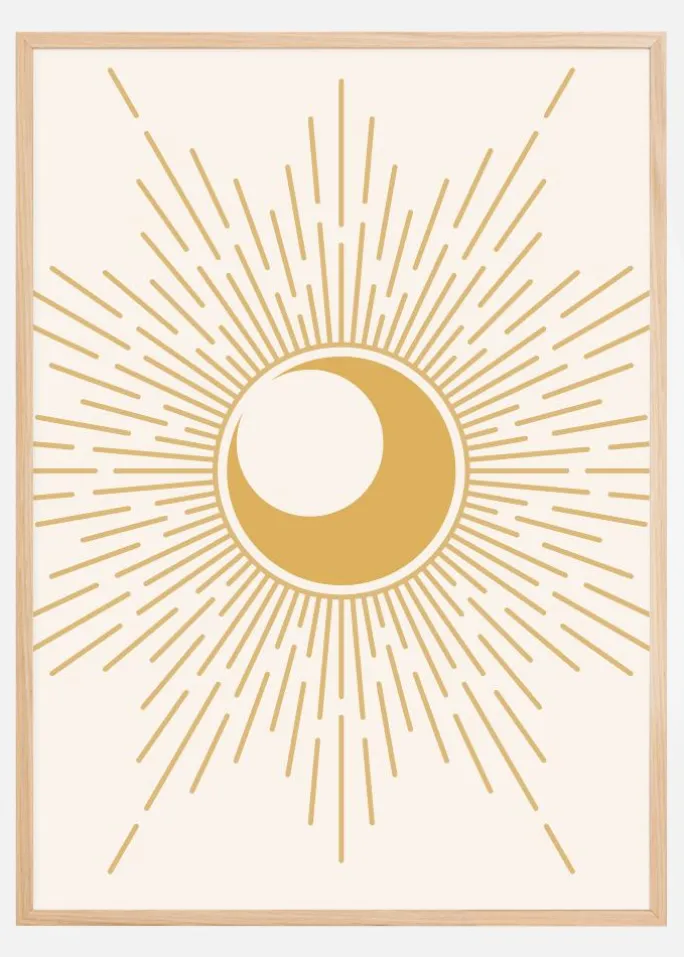 Denne solrige plakat, som udstråler varme og livsglæde, er et strålende tilføjelse til ethvert rum, der har brug for et lysglimt. Med sit centralt placerede gyldne solmotiv omgivet af strålende lysstråler mod en blødt tonet baggrund, tilbyder designet en følelse af vitalitet og positiv energi. Det er et symbolsk kunstværk, der minder os om solens kraft til at oplyse og inspirere.