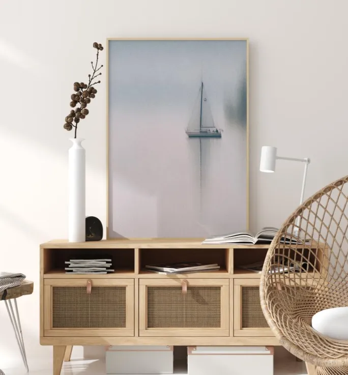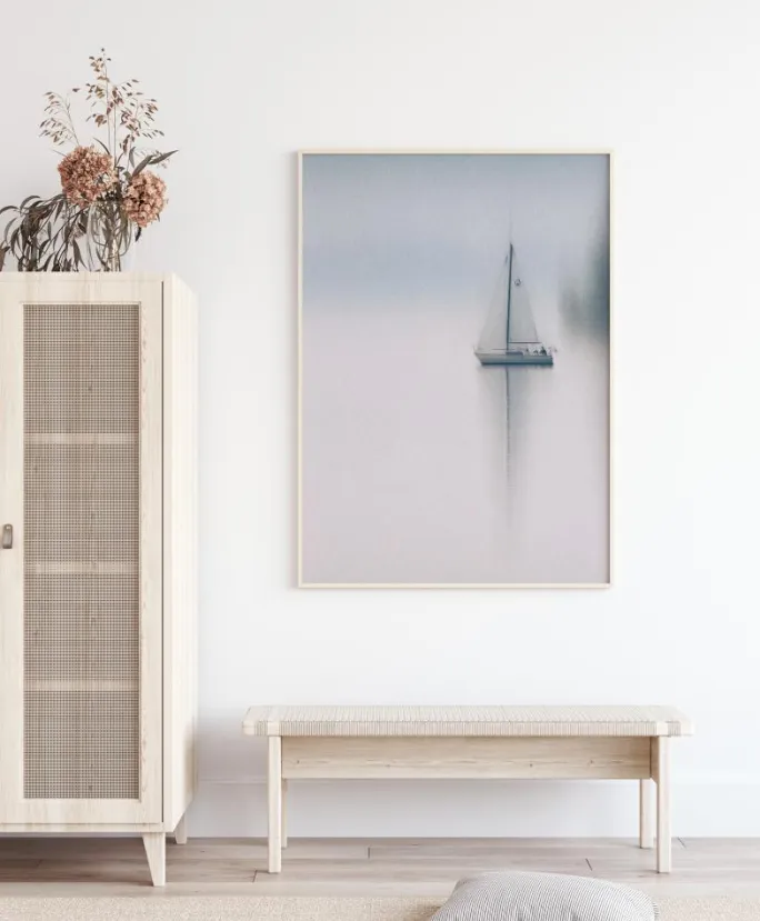 En beroligende plakat af en yacht midt på en lys hvid sø. Billedet er blødt med slørede kanter på alle billederne. Bådens sejl er langstrakt på vandet, mens den glider i den lyseblå og grå tåge på en tidlig søndag morgen.
