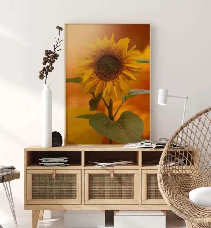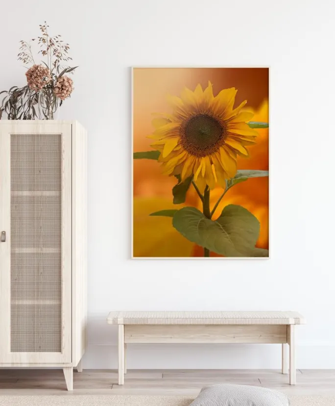 En klassisk plakat af en glasflaske og hovedet af en solsikke. Indhyllet i en blød sløring er dette stillebenbillede blødt og fredfyldt. De gule kronblade krøller sig blidt, mens blomsterhovedet hviler på hylden. Tilføj dette bløde pastelprint til en neutral væg for at opnå en beroligende effekt.