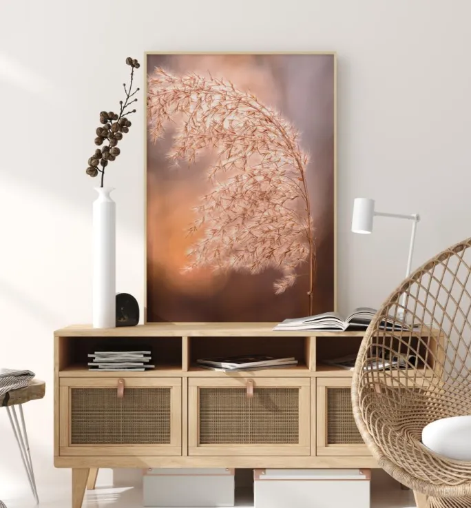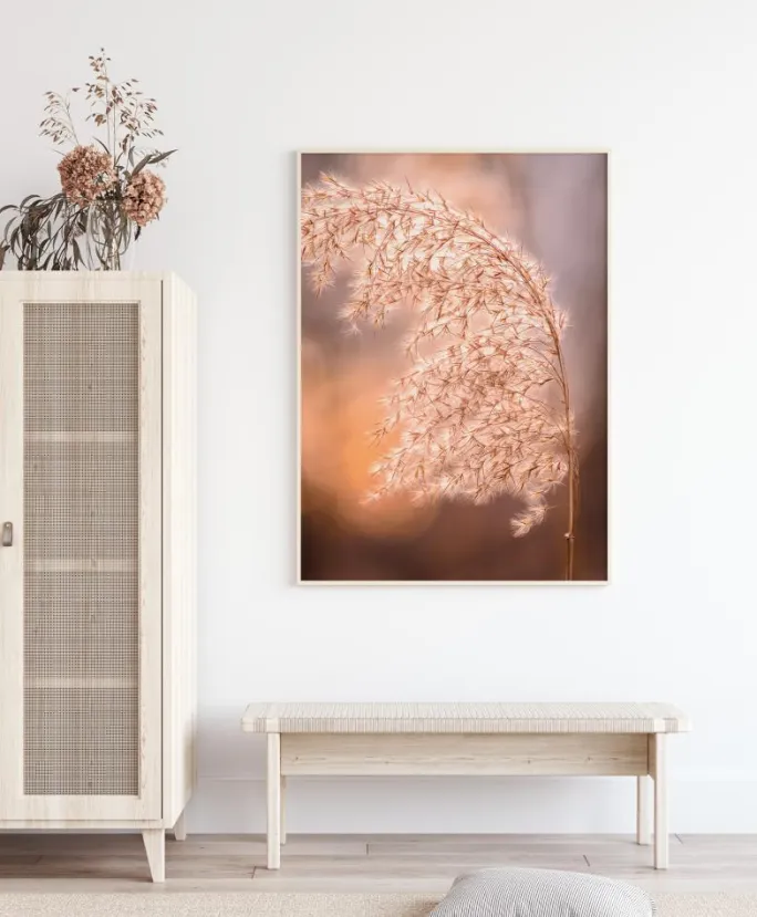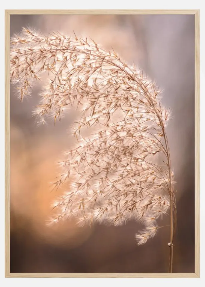 En sommerplakat af en høj stængel af blødt græs i den tidlige sommersol. Græsstænglen er ililumineret i et blødt ferskenfarvet lys, så de fluffy græsfrø har en glorie omkring dem. Fersken og lyserødt lys gennemsyrer billedet og skaber en sommerlig, romantisk stemning.