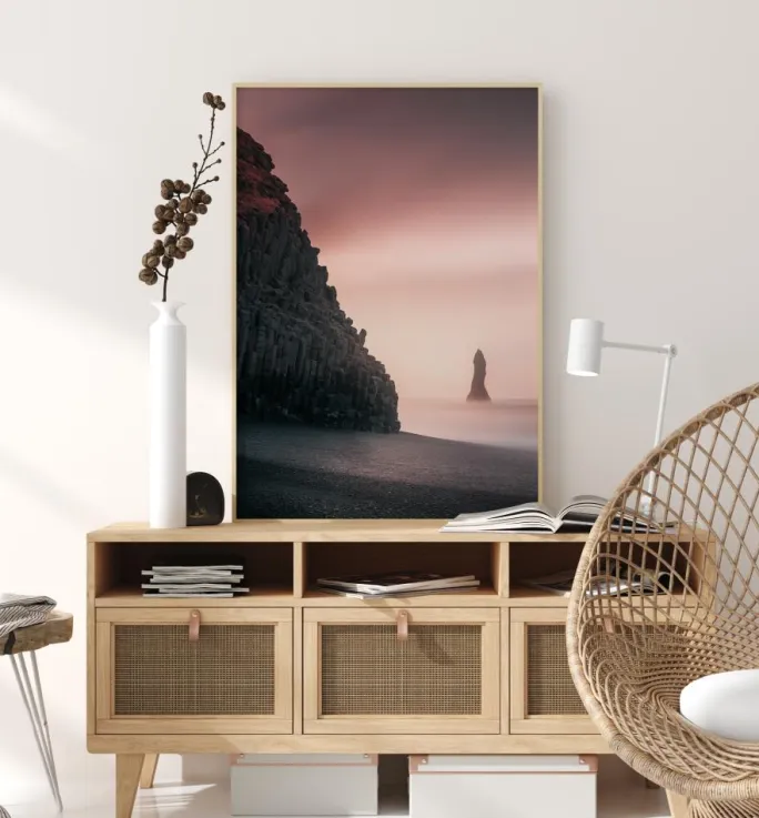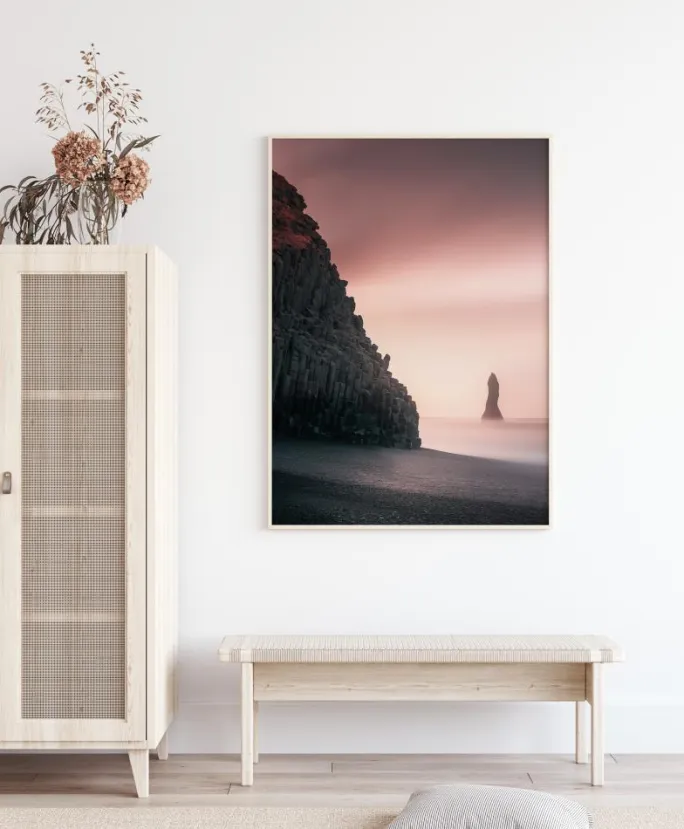 En episk landskabsplakat af en solopgang ved den sorte sandstrand Reynisfjara i Island. Stir ud mod havet på den ensomme klippe eller tag de mærkelige skorstensformer af basaltsten i øjesyn, mens de stiger op mod himlen. Dette er et magisk sted, der er gennemsyret af en lyserød glød.