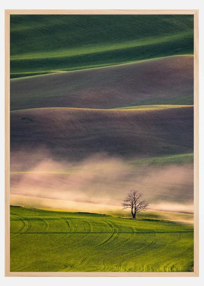 Et vidtstrakt landskab plakat med bølgende grønne bakker. Forskellige lyse grønne og brune farver dækker alt, hvad øjet kan se, mens bakkerne ruller ind i det fjerne og ser bløde og glatte ud som fløjl. Et ensomt træ i midten giver et fokuspunkt og en fornemmelse af det store rum i denne energigivende grønne plakat.
