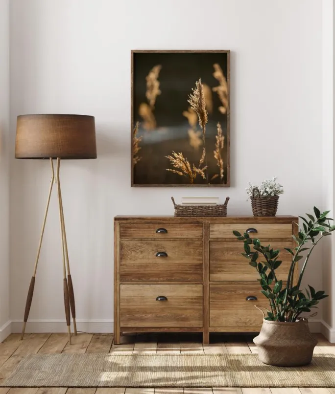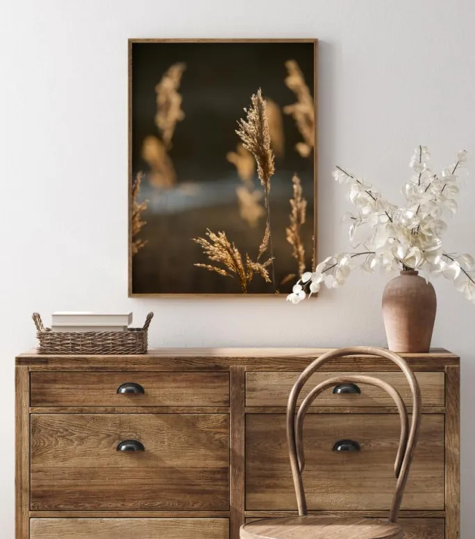 En sommerlig plakat med solskin på en mark. Nærbilleder af græskar svajer i en sommerbrise. De fanger solens gyldne lys, som også glimter fra den fjerne flod. Nyd dette stemningsfulde og bløde billede, der bringer sommeren hjem, når du hænger dette op.