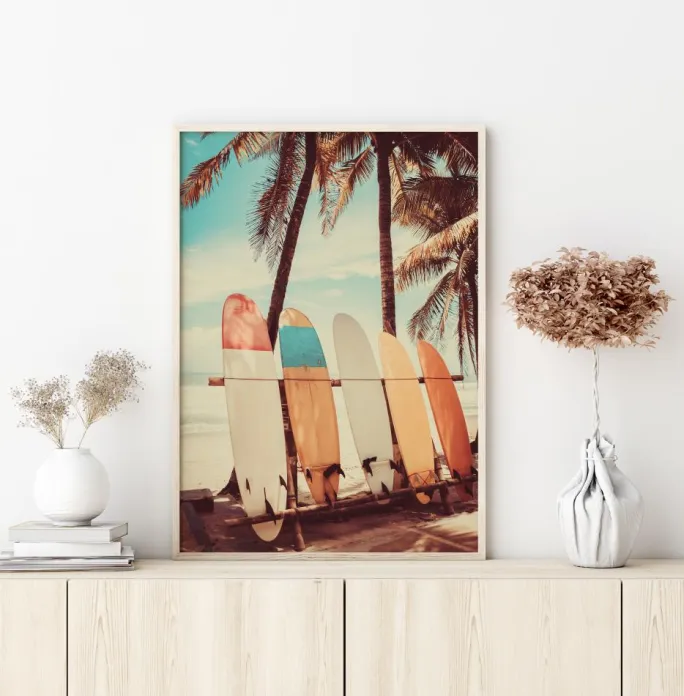 En strandplakat med en række surfbrætter, der hviler på en rist ved nogle palmer. Forskellige farverige surfbrætter venter bare på at blive brugt i dette udvaskede billede. Havet og sandet kigger frem bag brætterne og venter på, at du skal gribe et af dem og have det sjovt.