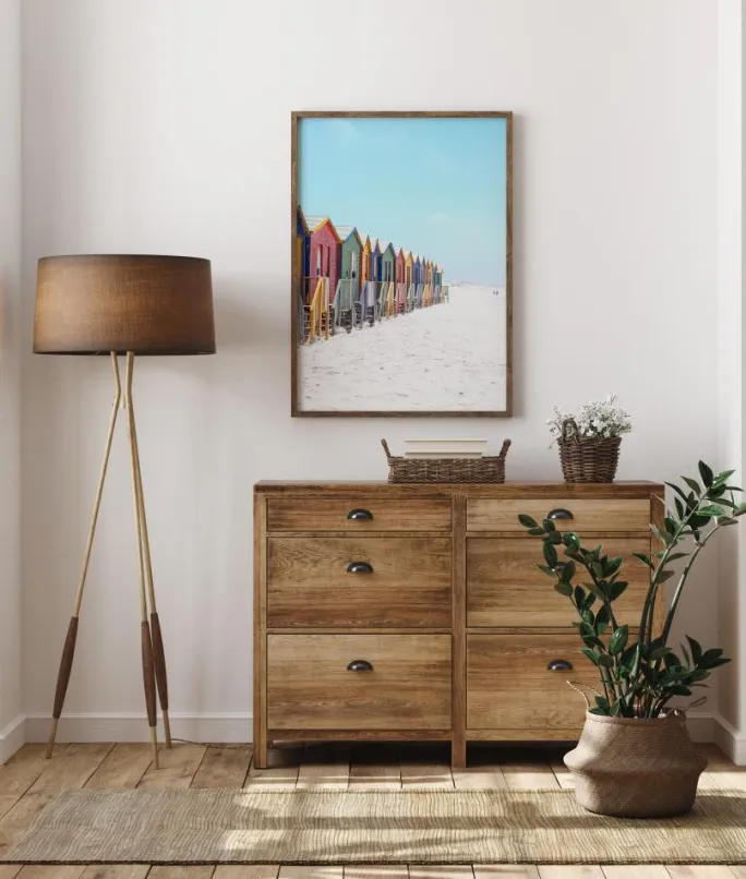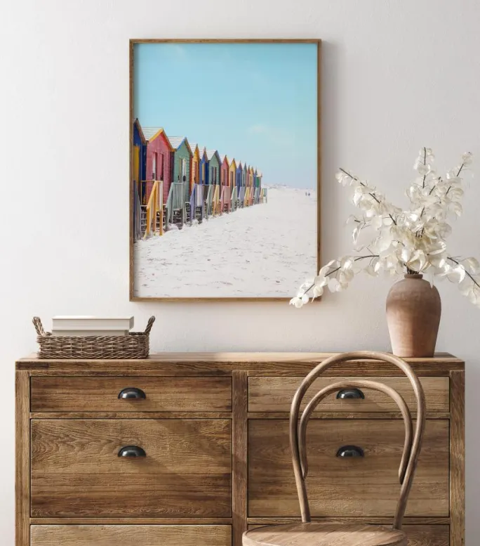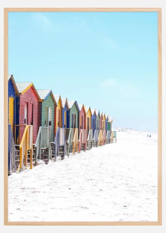 En strandplakat med en række strandhytter langs en hvid sandstrand med en blød blå himmel over sig. Hver af hytterne har en anden farve, herunder rød, grøn, gul og blå. Rækken af flerfarvede hytter trækker øjet dybt ind i billedet og den varme sommerfornemmelse, som den disede himmel giver.