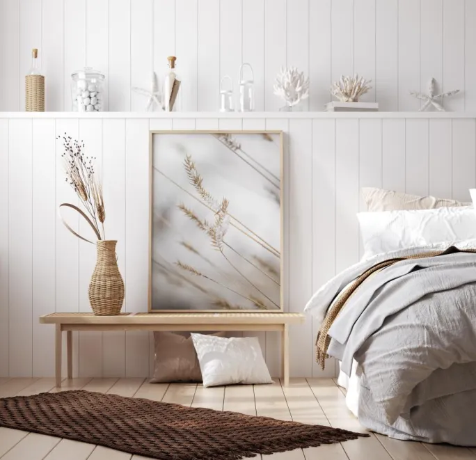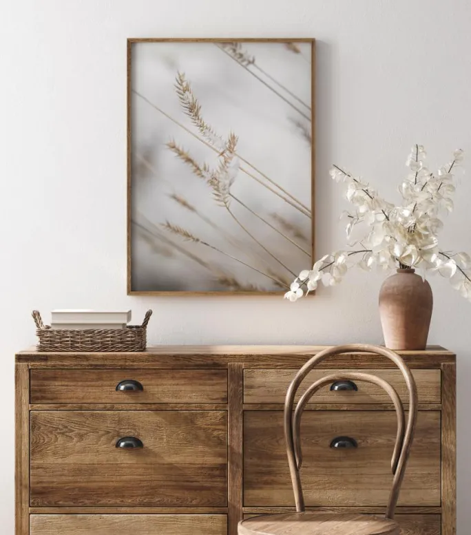 En naturlig plakat med svajende siv på en blød hvid baggrund. De gyldne siv er tynde og fine. Nogle er klart fokuseret, mens andre ikke er det, hvilket skaber dybde i denne enkle, men elegante plakat. Tilføj den til en cremefarvet væg for at bevare den blødhed.