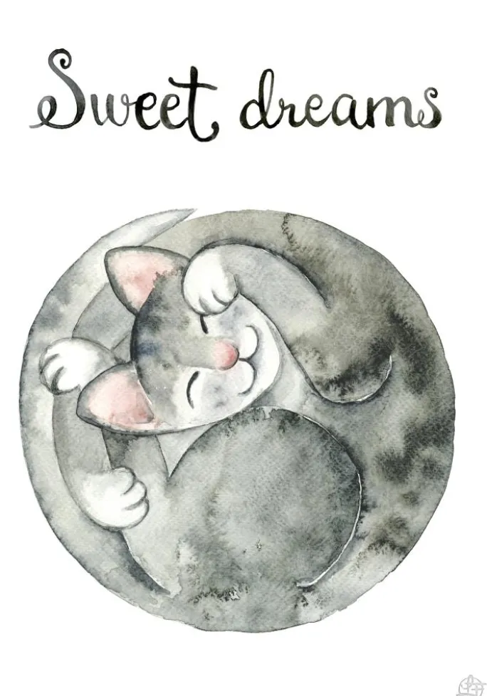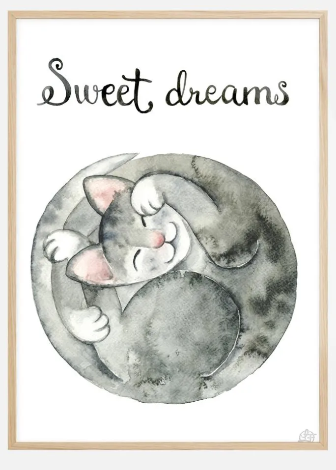 En inspirerende plakat med en sød sammenkrøllet grå kat. Den søde kat krøller sig rundt om sig selv for at lave en kugle, mens den smiler lykkeligt i sin søvn. Plakaten ønsker dig søde drømme og er den perfekte tilføjelse til ethvert soveværelse til en afslappet nat.