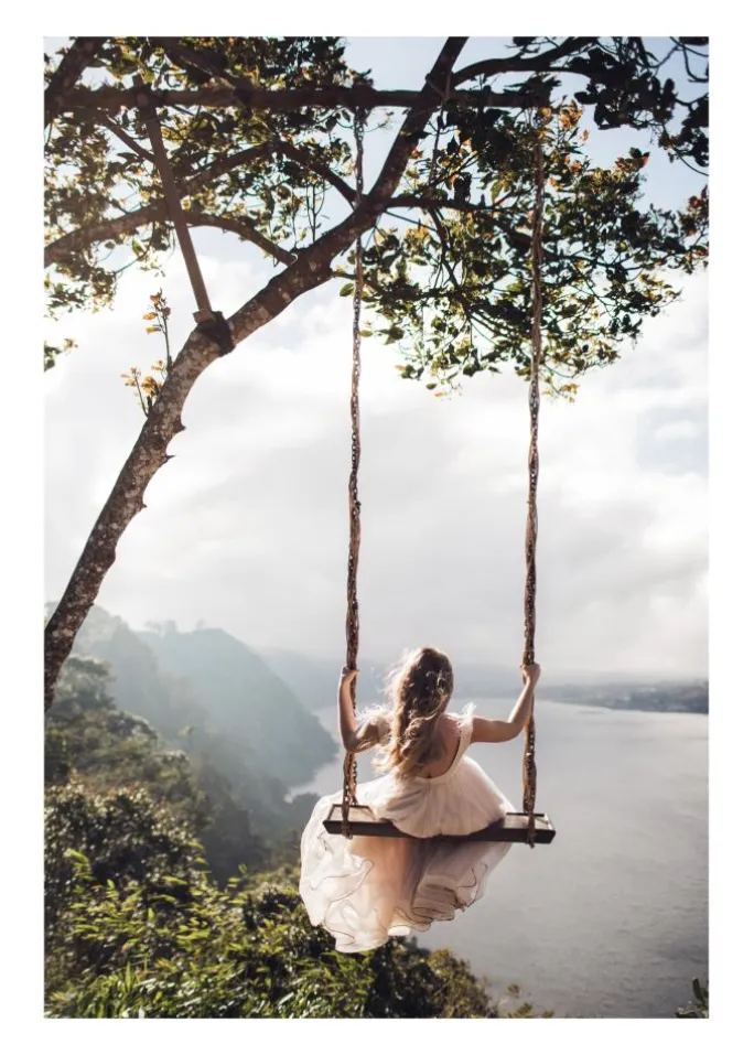 En fredfyldt plakat med en fantastisk udsigt over en bugt med en pige, der sidder på en gynge i et træ og ser ud over det hele. Pigens blonde hår bevæger sig i brisen, der også bølger hendes bløde hvide kjole. Udsigten er fantastisk, en bugt med omkringliggende bjerge på en blød, overskyet himmel. Hæng denne udsigt op for at føle det fjerne land i dit hjem.