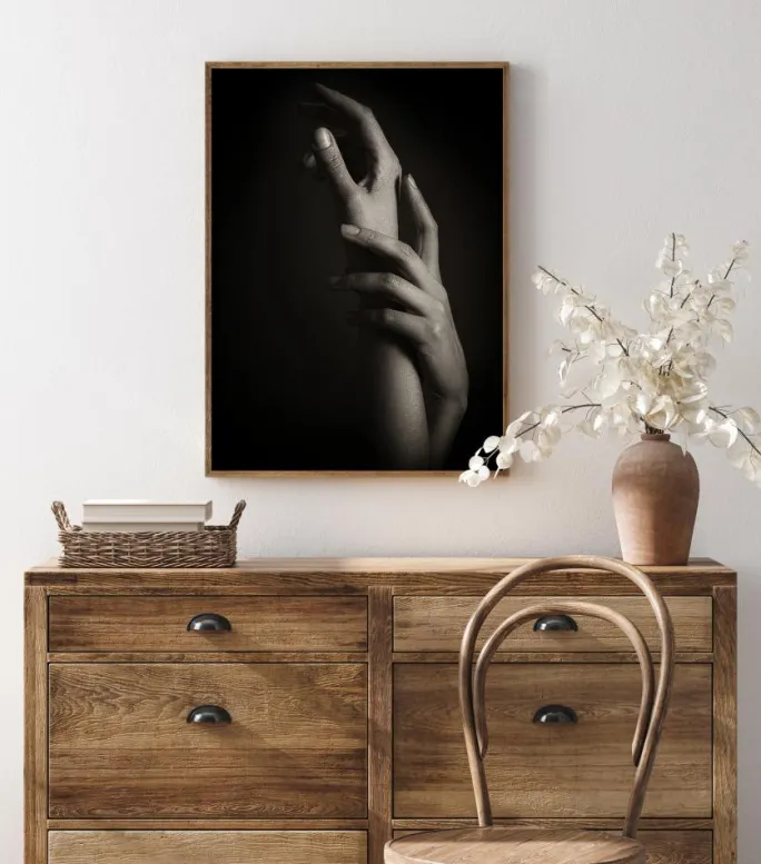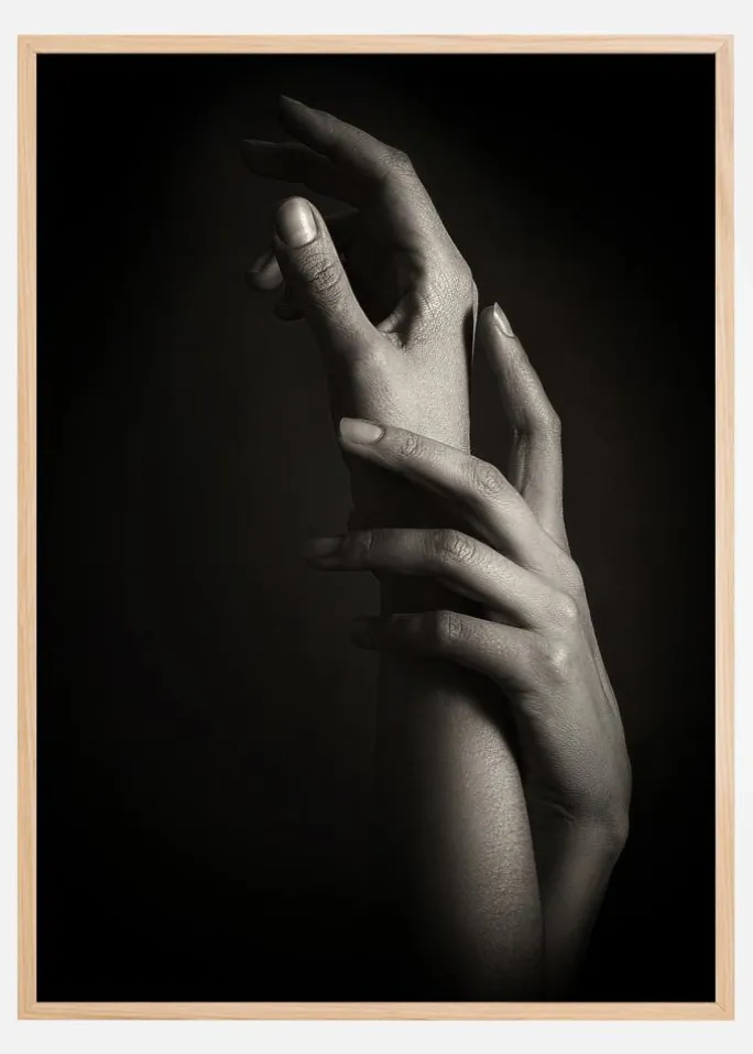 En sort/hvid plakat af to hænder, der holder fast i hinanden. To hænder snor sig rundt om sig selv, den ene hånd griber om den andens håndled i en elegant positur. Lyset fremhæver den højre side for at skabe dybe skygger og kontraster. Hæng den på en hvid væg for at skabe en stemning af et fotostudie.