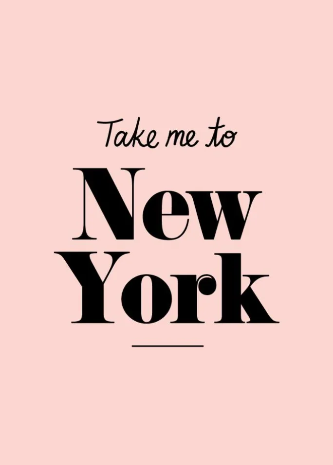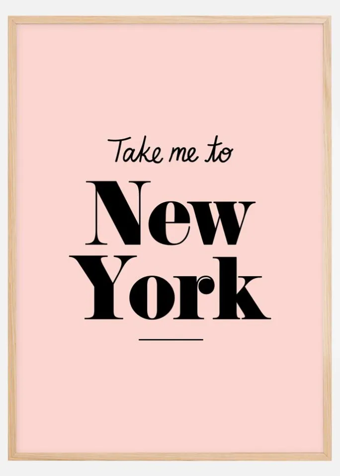 Længes du efter New York, men har ikke råd til at rejse lige nu? Send et budskab til dine velhavende nære og kære ved at sætte denne charmerende plakat på væggen! Plakaten har et stilfuldt og enkelt design med teksten ”Take me to New York” i sort mod en laksepink baggrund. Farverne passer fremragende sammen med en sort ramme fra vores store udvalg. Prints findes i 6 forskellige størrelser og prisklasser.
