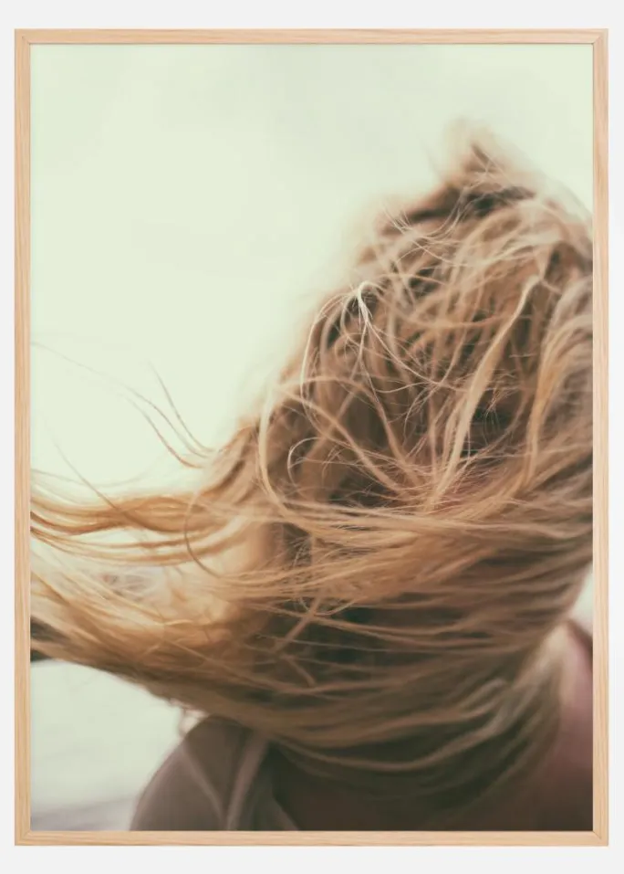 En enkel portrætplakat af en blond pige med blondt hår i vinden. Hendes hår blæser hen over hendes ansigt og skjuler det, men hvis du ser nærmere efter, kan du se et enkelt øje, der kigger tilbage på dig. Følg denne pige udenfor, mens du nyder denne fængslende plakat.