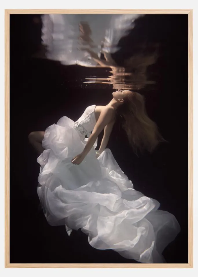 En dramatisk plakat af en kvinde i en hvid kjole, der flyder under vandet. Hendes kjole bølger ud som skyer, mens hun læner sig tilbage med lukkede øjne lige under vandoverfladen. Hendes spejlbillede projiceres opad mod vandets overflade i dette magiske øjeblik af stilhed.