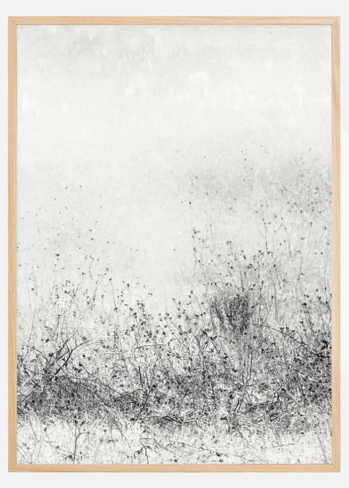 En kunstnerisk plakat af endeløse græsmarker i sort/hvid. De skrabede prikker og linjer får det til at ligne et sammenfiltret tyndt buskads af græs og brombær. Den minder om en Jackson Pollack med sine mærkelige krakeleringer på tværs af siden. Linjerne står skarpt og lyse på en hvid baggrund.