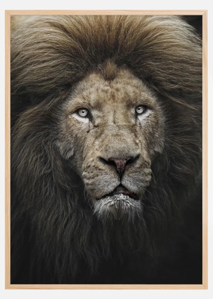 Denne plakat præsenterer et imponerende og detaljeret portrætbillede af en løve. Dens fascinerende blik er fanget i fuld farve, hvilket giver en dyb og sjælelig følelse, der gennemsyrer hele motivet. Med en mængde naturlige nuancer, der træder frem i dens tykke manke, fra gyldenbrun til blødere beige og grå, skabes et livligt billede, der afspejler dyrets kraftfulde essens. Plakaten er en hyldest til skovens rå skønhed og en sand åbenbaring af junglens konge i al sin pragt.