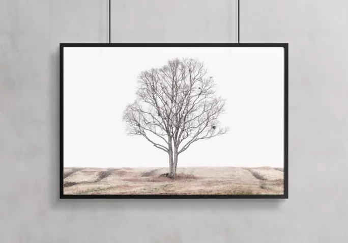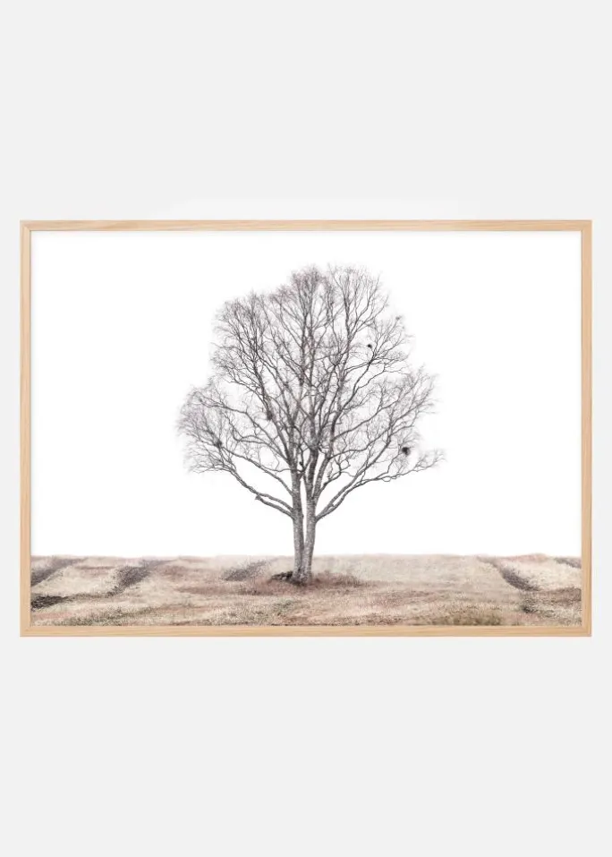 En barsk plakat af et enkelt ensomt træ om vinteren. Det nøgne træ står midt på en snebestøvet mark med en lys hvid baggrund bagved. Det er majestætisk, men giver også en koldt vejr-stemning. Bring et stykke vinter ind i dit hjem med dette overbevisende billede og lys op på en mørk væg.