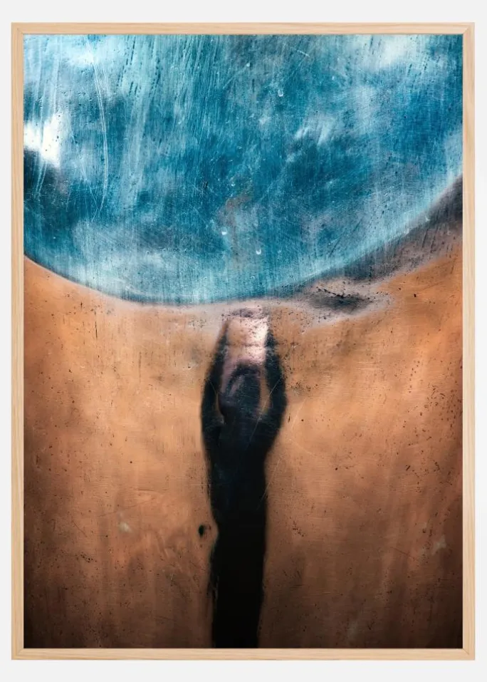 En malerisk plakat af en person, der giver et offer. Dette abstrakte billede kan fortolkes, som du vil. En blå cirkel fylder toppen af billedet, mens brune og orangefarvede farver fylder resten af billedet. En sort figur rækker op mod den blå cirkel og holder en lille rektangulær hvid genstand som offergave. Fascinerende og overbevisende, det perfekte samtaleemne.
