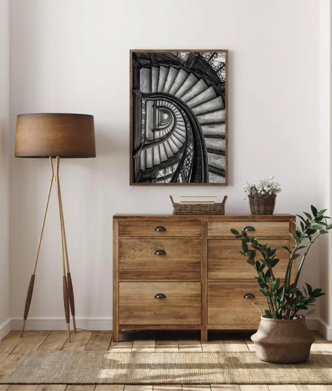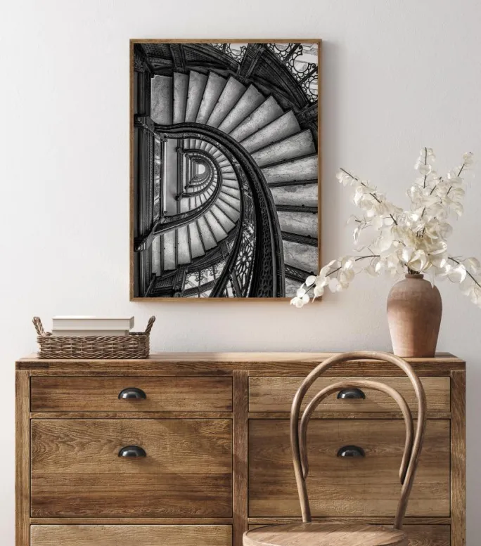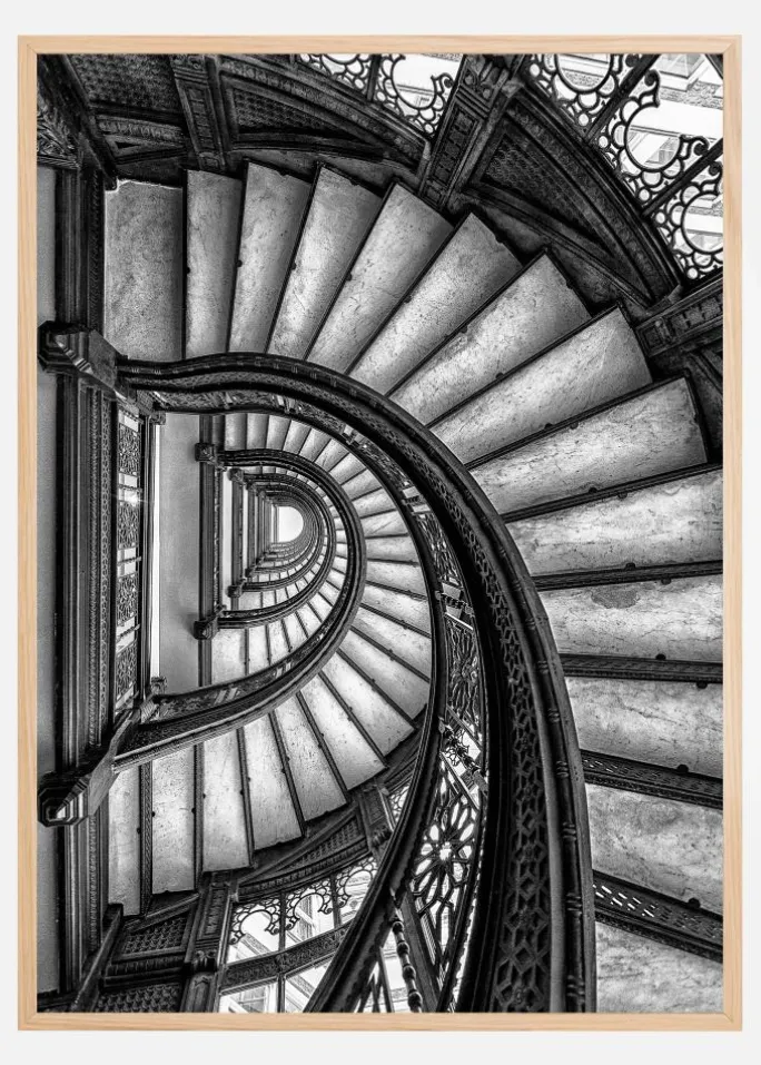 En indvendig plakat med et sæt vindeltrapper, der snor sig ned til bunden af bygningen. Set ovenfra snurrer trapperne væk. De smedejernsbelagte gelænder er detaljeret og skiller sig ud fra de enkle, ensfarvede trin. De kontrastfyldte toner giver dette værk dybde, mens øjnene bliver suget helt ned til bunden.