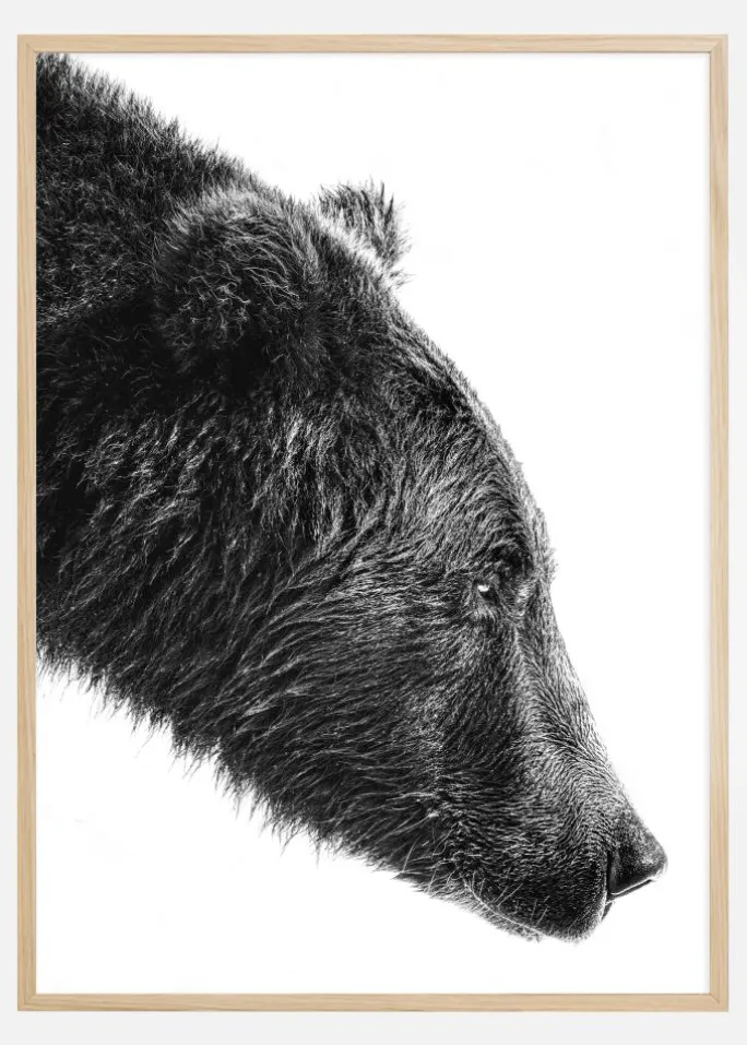 Dette stilrene og kraftfulde print præsenterer en nærbillede af en bjørn i sort-hvid, et motiv der giver en rå og ærlig følelse af naturens utæmmelige ånd. Billedet er fokuseret på bjørnens profil, hvor hver detalje i pelsen og de rolige øjne fremhæves takket være kontrasten mellem de mørke og lyse toner.