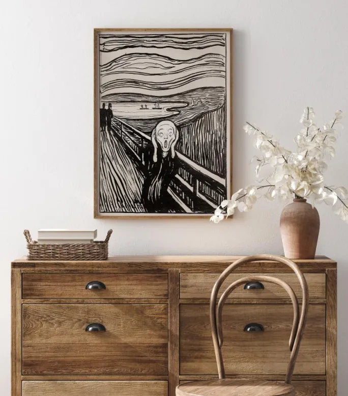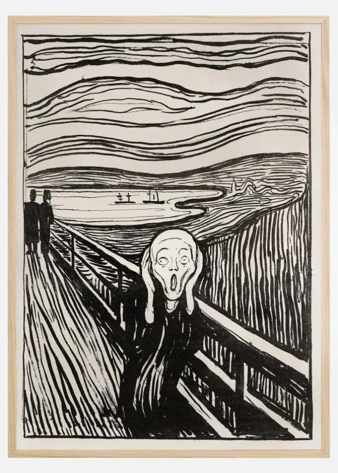 En abstrakt ekspressionistisk plakat af Edvard Munchs “Skriget” i sort/hvid. Dette ikoniske og øjeblikkeligt genkendelige sort-hvide print fokuserer på det skrigende hvide ansigt af personen på broen. Vis din viden om kunst med dette klassiske billede på en farvet væg derhjemme.