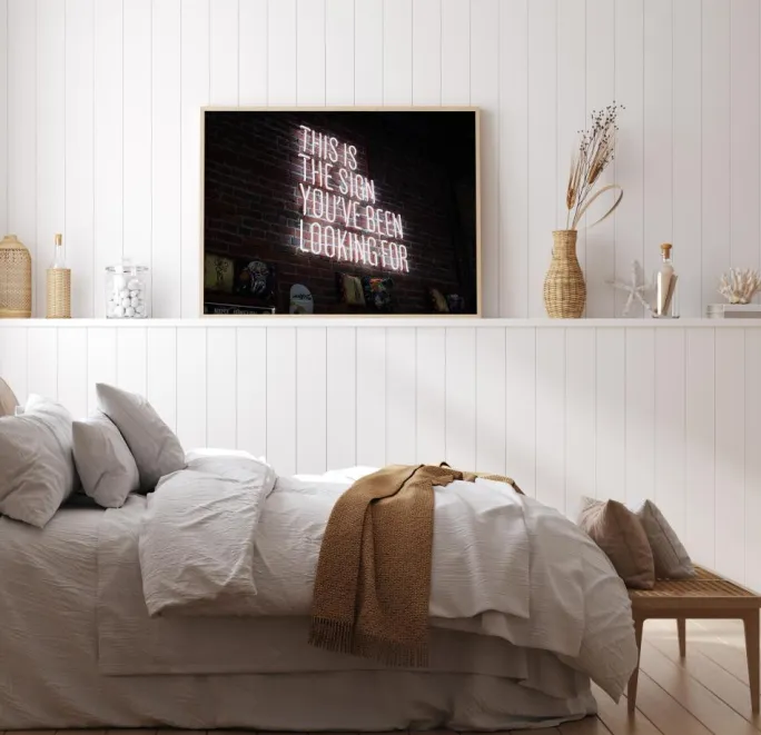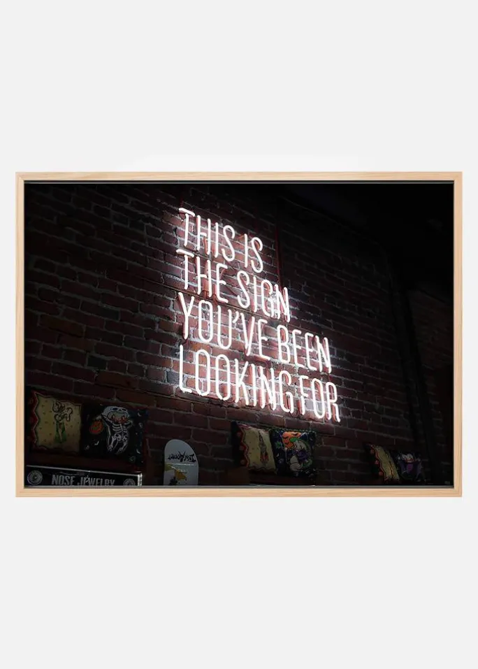 En humorfyld fotografisk tekst plakat med budskabet “This is the sign you’ve been looking for”. De skarpe kontraster mellem de hvide bogstaver og den røde murstensvæg sikrer, at du ikke risikerer at overse den vigtige besked.