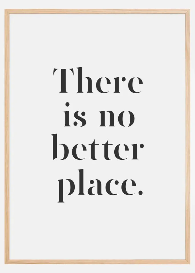Opdag vores minimalistiske og stilrene plakat, der formidler en følelse af ro og hjemlighed med dets enkle budskab “There is no better place”. Denne moderne tryk er perfekt til dem, der værdsætter skandinavisk design og tydelige, men kraftfulde budskaber i deres boligindretning. Motivet, som er begrænset til en klassisk sort tekst på en hvid baggrund, bliver en tidløs indretningsdetalje, der passer i såvel et moderne som et mere traditionelt hjem.