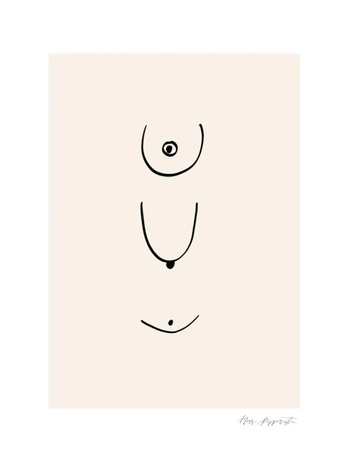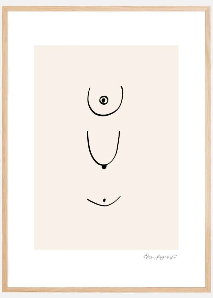 En abstrakt plakat med forskellige sorte linjer på en hvid baggrund. De enkle linjer ser ud som om de tegner et kvindebryst i forskellige positioner og fra forskellige synsvinkler. Linjerne er enkle og elegante. Se, hvad du vil se i disse kurvede former og prikker.