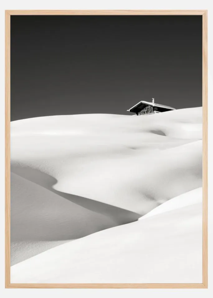 En vinterplakat af et hus, der er skjult på toppen af en massiv sneklædt bakke. Sneen fylder billedet i glatte rullende banker. Øverst på plakaten kigger en lille hytte isoleret ud over toppen af bakken. En mørkegrå himmel gør sneen ekstra lysende og giver en kølig vinterstemning.