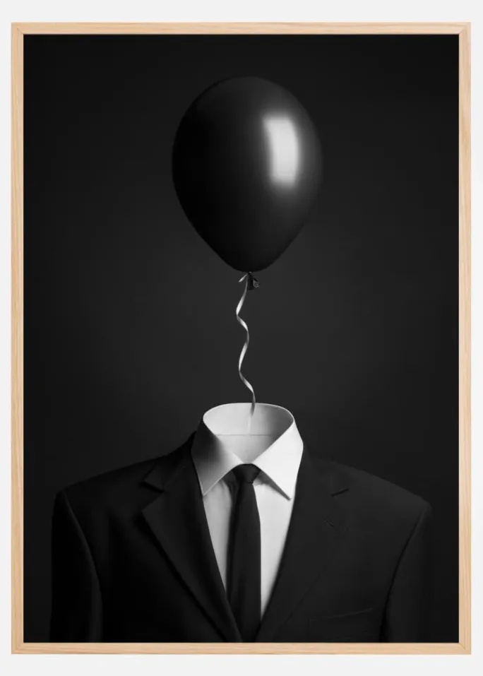 En impressionistisk plakat af et tomt jakkesæt med en sort ballon, der kommer ud af kraven, hvor hovedet skulle være. Ballonens snor, der dingler ind i kraven og leder øjet op til ballonens lyse glans mod den sorte baggrund, er finurlig og usædvanlig.