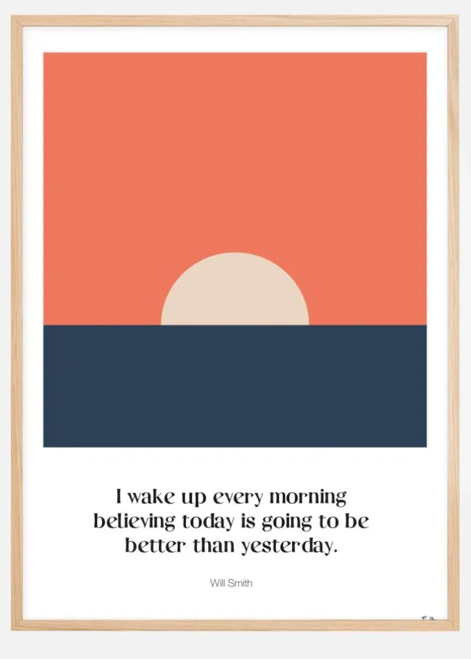 En plakat med Will Smiths citat “I wake up every morning believing today is going to be better than yesterday” skrevet under en grafisk illustration af en solopgang. En flot og stilren plakat skabt af Tim Hansson.