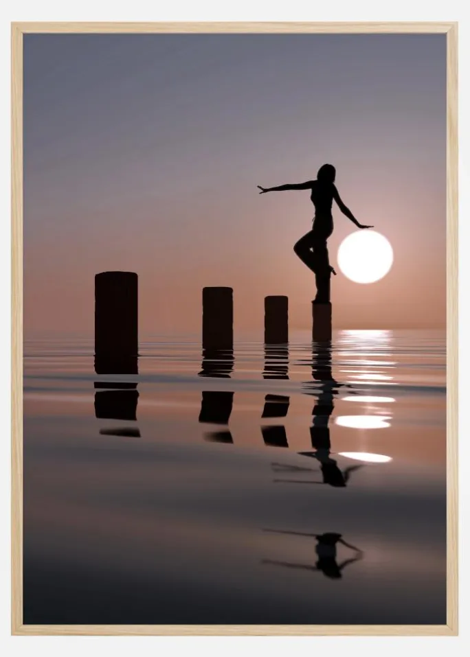 En engleagtig plakat af en pige, der balancerer på pæle i havet. Pigen og pælene er i silhuet, mens hun står på en fod. Den ene hånd strækker sig tilbage. Billedets vinkel får det til at se ud som om hun hviler sin hånd på den nedgående sol. Dette og de bløde pastelfarver skaber et magisk aftenbillede, der giver en afslappet stemning.