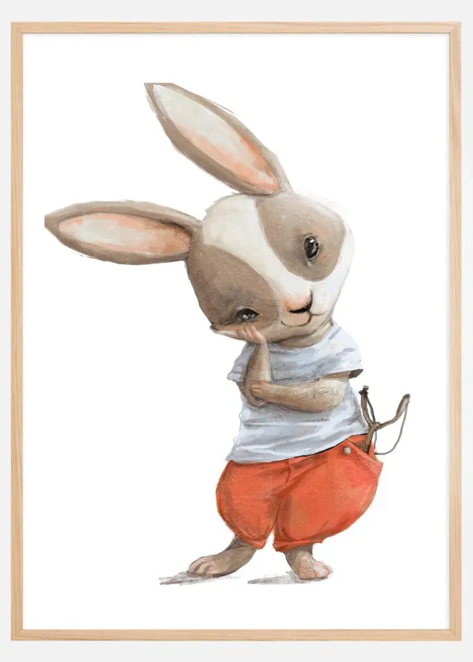 Denne underfundige og charmerende plakat viser en snedig lille kanin, klar til dagens eventyr. Med en kækk holdning og en slynge i hånden, ser kaninen ud til at have noget frækt i tankerne. Den dygtige akvarelmaleri fanger kaninens legende natur, og dens tøj giver et hint om en personlighed fyldt med nysgerrighed og opdagelsesglæde.