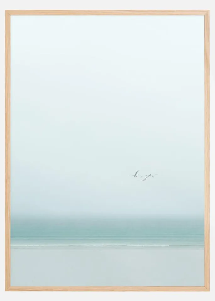 En enkel plakat af to fugle, der flyver over havet. I baggrunden er både havet og himlen så bløde hvide og blå farver, at det er svært at se, hvor det ene begynder og det andet stopper. Farverne er beroligende, og bare de to fugles bevægelse er iøjnefaldende og fanger øjet i denne elegante, men enkle plakat.