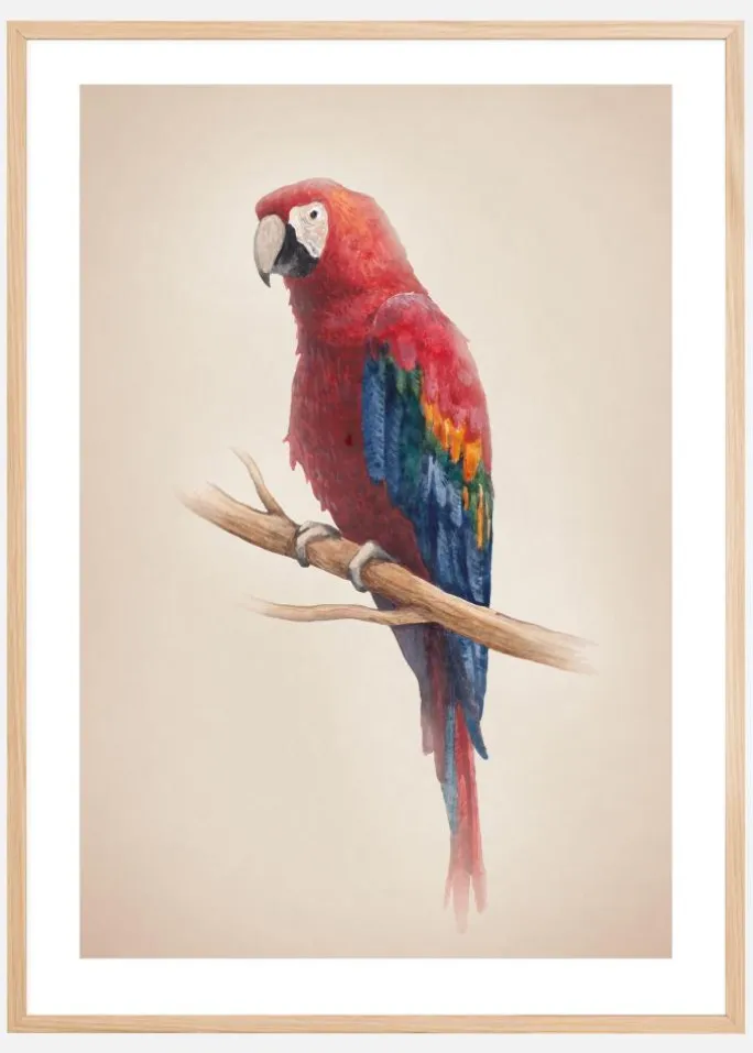 En lys portrætplakat af en skarlagensfarvet ara. På dette maleri af en ara sidder denne flotte fugl på en tynd brun gren på en grå baggrund. De lyse røde, gule og blå fjer er omhyggeligt malet for at skabe en rigtig fjeragtig fornemmelse. Tilføj dette til en grøn baggrund, og bring denne fugl tilbage til regnskoven.