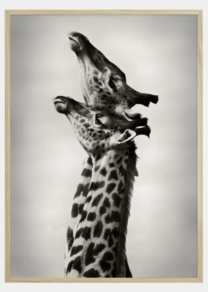 Plakaten viser et fortryllende øjeblik mellem to giraffer, der synes at dele en øm interaktion, deres halse elegant bøjede mod hinanden. Billedet er fanget i sort-hvid, hvilket forstærker de ikoniske mønstre på giraffernes hud og skaber en stærk visuel kontrast mod den bløde himmelbaggrund.