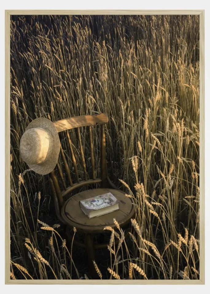 En gylden plakat af en hvedemark under solen. Midt på marken står en ensom træstol. En stråhat og en bog sidder på stolen i dette gyldne lys. Husk at tage en pause og finde dit eget stykke ro og fred.