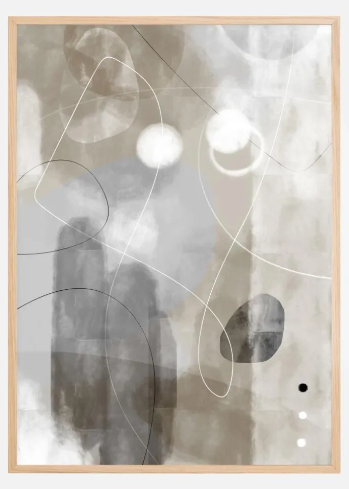 En magisk plakat med abstrakte linjer og former i lyse pastelblå og gråtoner. Hvide cirkler danser rundt om dette billede som glødende lyskugler. Hvide og sorte linjer kradser hen over værket med mørkere former bagved, hvilket skaber en blød samling af billeder, som om lyset reflekteres over overfladen.