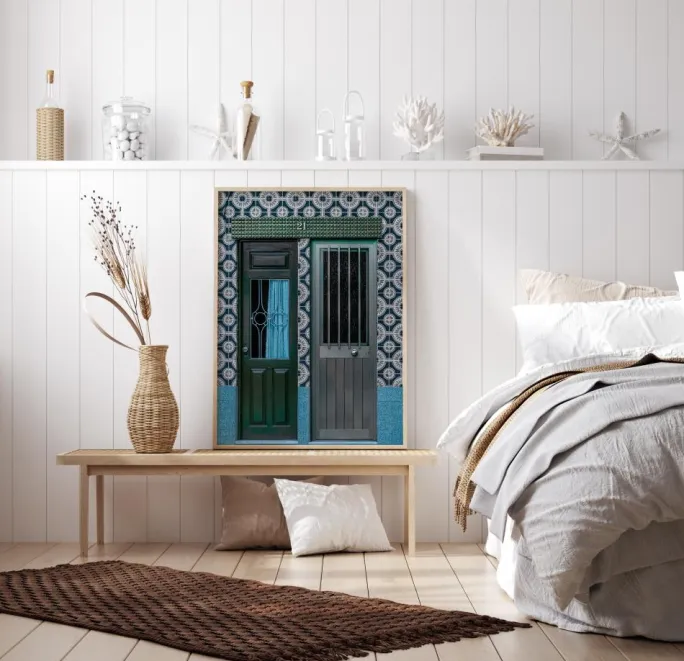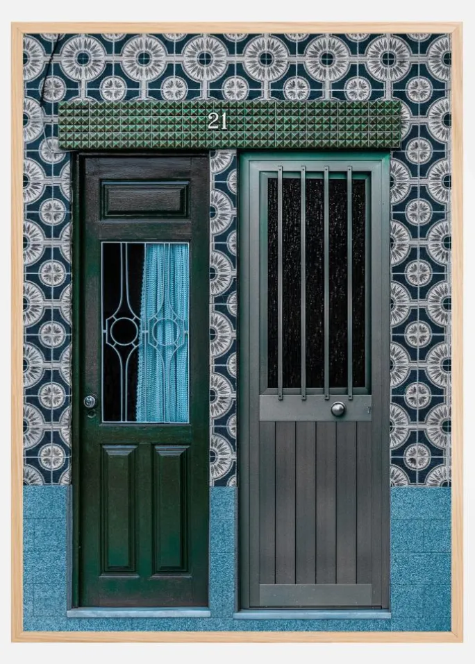 En interiørplakat med to døre ved siden af hinanden på en lyseblå flisebelagt væg. Hver dør har et andet design, den ene er grøn, den anden grå. De sidder begge under skiltet nummer 21, så går de til det samme hus, eller er de forskellige steder? Tag dette med hjem, og lad din fantasi gøre resten.