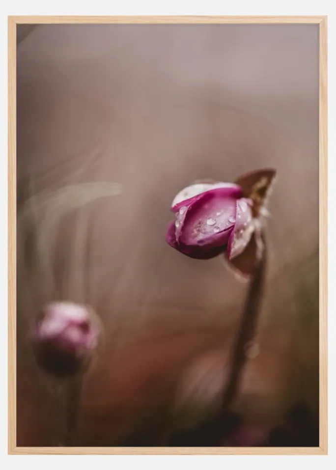 Denne plakat byder på naturens stille skønhed i ethvert rum. Billedet fanger to fortryllende blomsterknopper, hvis dække af morgendug reflekterer et stille løfte om nyt liv. Den forgrunden knop er i fokus, med en blød, drømmende baggrund, der får den til at fremstå som en naturlig juvel. Dens lyserøde farvetoner fremhæves af vanddråberne, hvilket giver en frisk og opkvikkende følelse.