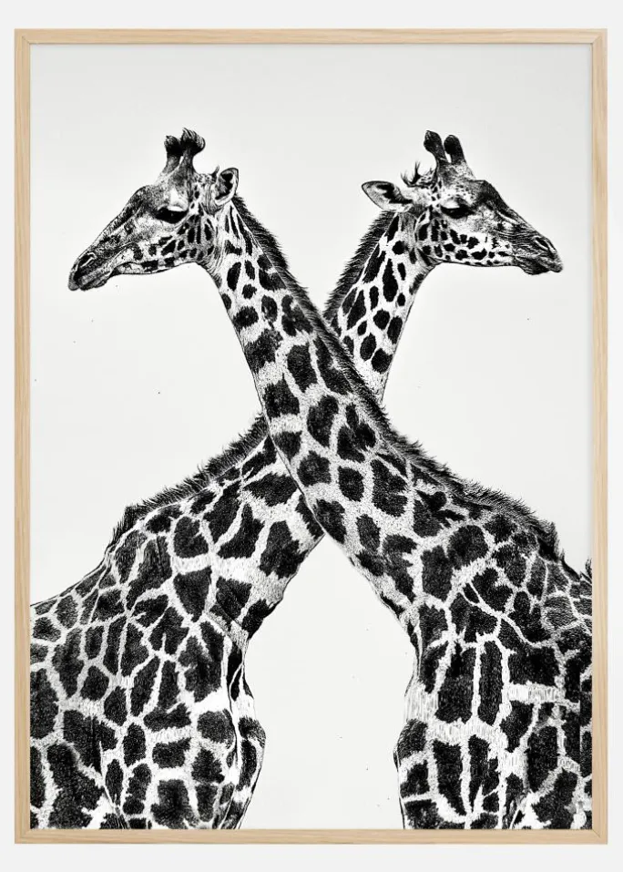 Oplev den majestætiske skønhed ved naturens langbenede ikoner med vores sort-hvide giraf-plakat. Denne tankevækkende komposition fanger to giraffer, hvis halse yndefuldt krydser hinanden og skaber en nærmest symmetrisk form, der trækker blikket opad. Detaljerigdommen i tegningen fremhæver giraffernes unikke mønstre, hvilket gør dette til et elegant og moderne kunstværk, der passer perfekt i et minimalistisk hjem eller kontor. Kontrasten mellem de dristige, sorte pletter og den rene hvide baggrund gør dette print til en sand visuel nydelse og tilfører en følelse af naturens vidundere til dit rum.