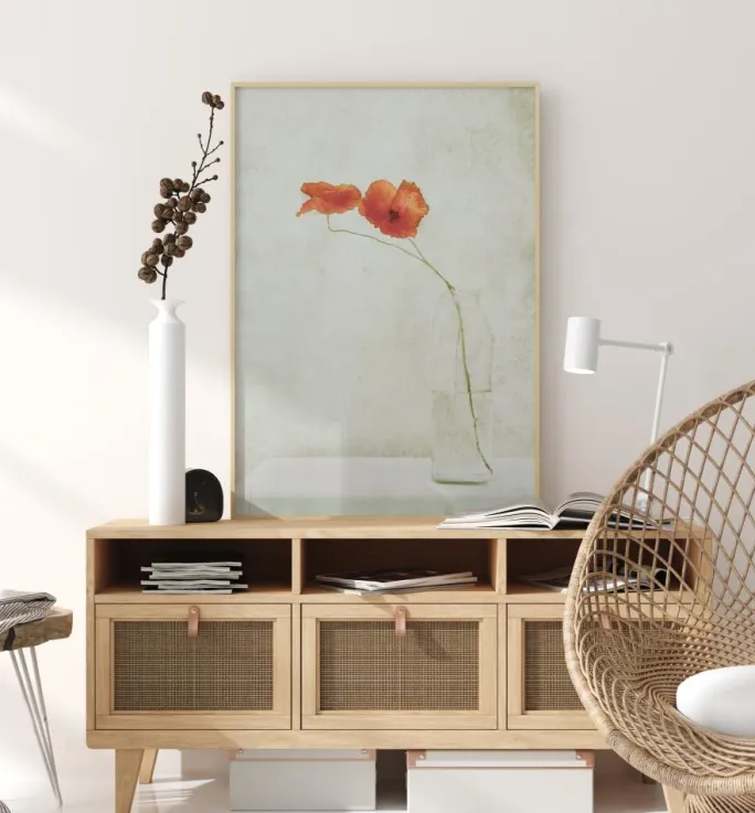 En stillebenplakat af to røde valmuer i en klar glasflaske. Flasken forsvinder i baggrunden på den hvide væg. De to knaldrøde valmuer er fint malet og trækker øjet til sig, da de er det eneste farvesprøjt i denne enkle, smagfulde plakat.