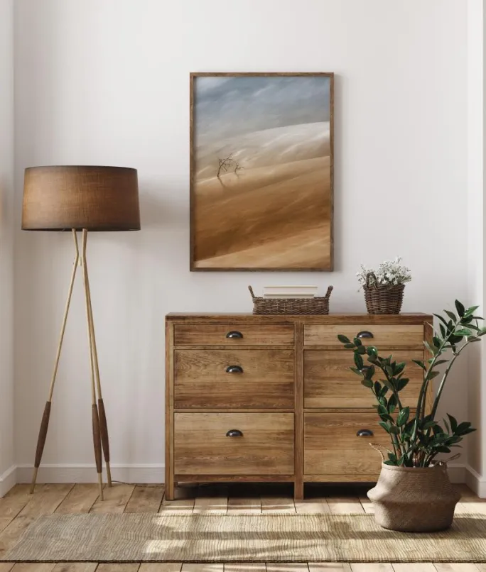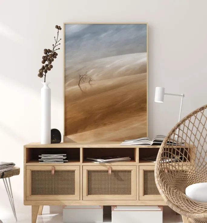 En vidtrækkende ørkenudsigt med to ensomme træer. De bløde pastelgule og blå farver skaber et harmonisk syn for ethvert rum i huset. Lad dig rive med af denne fantastiske scene.