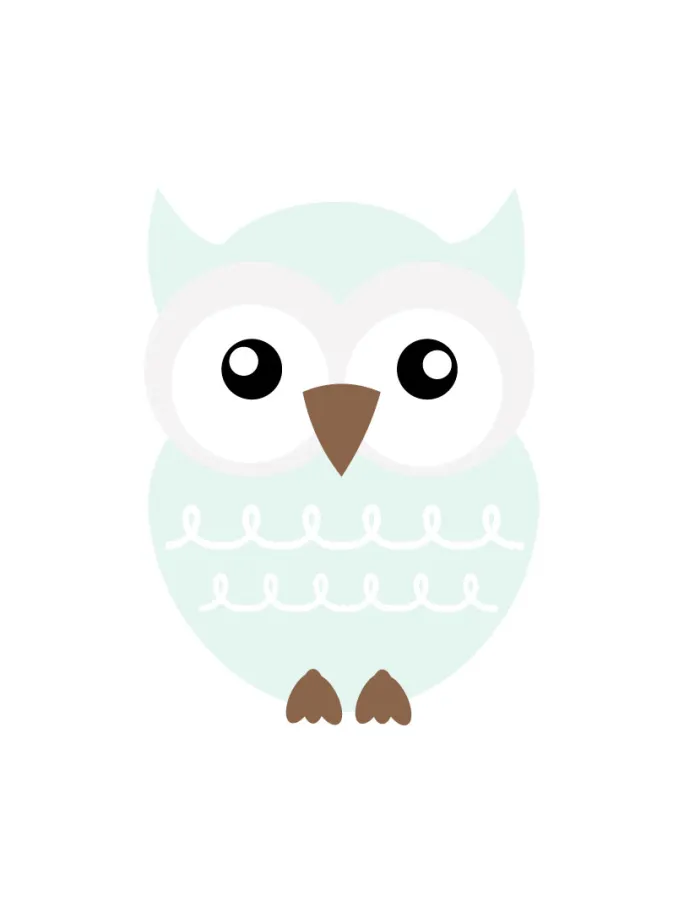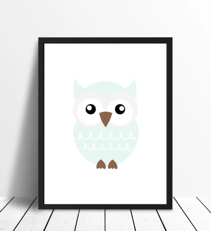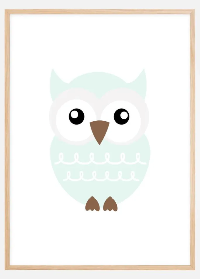 Sød plakat med det indendørs pipfugl nummer ét, uglen. Illustrationen af en stiliseret isblå ugle mod hvid baggrund er blevet en moderne klassiker. Motivet passer lige så godt ind i stuen som i børneværelset og gør sig ekstra godt med en indretning, der tager farven op fra billedet. Kombiner med andre fugle eller dyr for en vild følelse.
