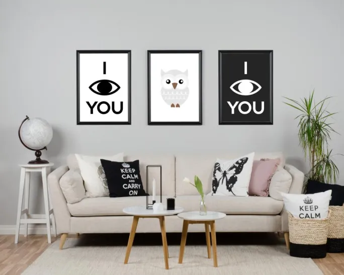 Sød plakat med indendørsfugl nummer ét, uglen. Illustrationen af en stiliseret dimgrå ugle mod hvid baggrund er blevet en moderne klassiker. Motivet passer lige så godt ind i stuen som i børneværelset og gør sig ekstra godt med en indretning, der tager farven op fra billedet. Kombiner med andre fugle eller dyr for en vild følelse.