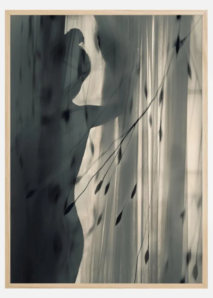 En portrætplakat af en person, der ser ud gennem et gardin mod omverdenen. Det bløde, gennemsigtige stof blæser hen over billedet, mens personens silhuet læner sig op ad vinduesrammen. Blødt lys udefra oplyser scenen lige nok til, at man kan se, hvad der foregår.