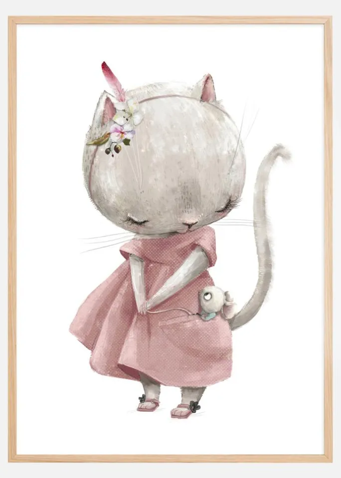 Denne bedårende plakat viser en sød scene af en usædvanlig venskab; en lille mus der hviler trygt i kattens favn, begge klædt i festligt tøj. Katten er fint klædt i en lyserød kjole, komplet med en elegant blomsterdekoration på hovedet. Den fine akvarelmaleri giver dyrene en blødhed og varme som udstråler venskab og tillid.