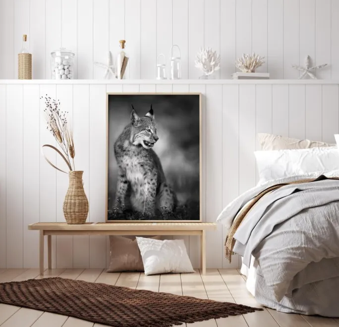En dyrelivsplakat af en bobcat, der sidder i græsset. Katten kigger ud til højre i billedet, muligvis for at se på et potentielt bytte. De lyse pletter i dens pels og dens ørepuder står tydeligt frem i detaljer. Sæt dette sort-hvide print på en grøn væg for at skabe en naturlig følelse.
